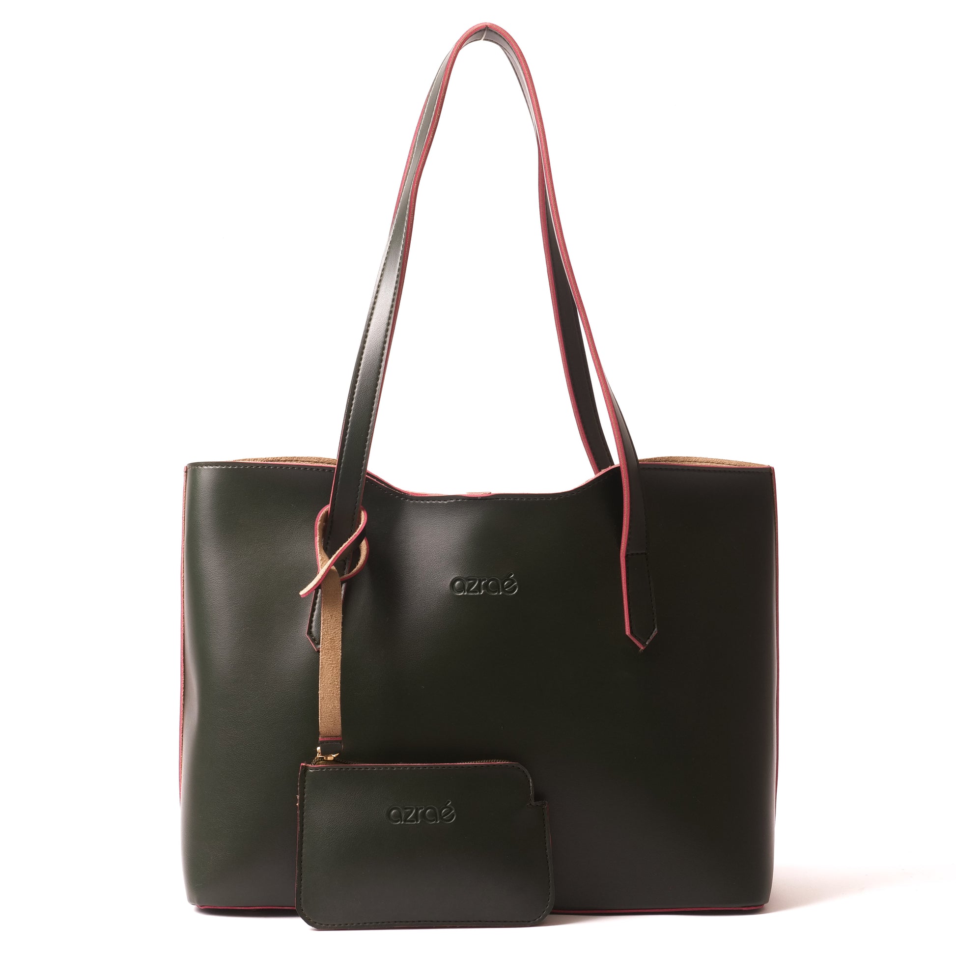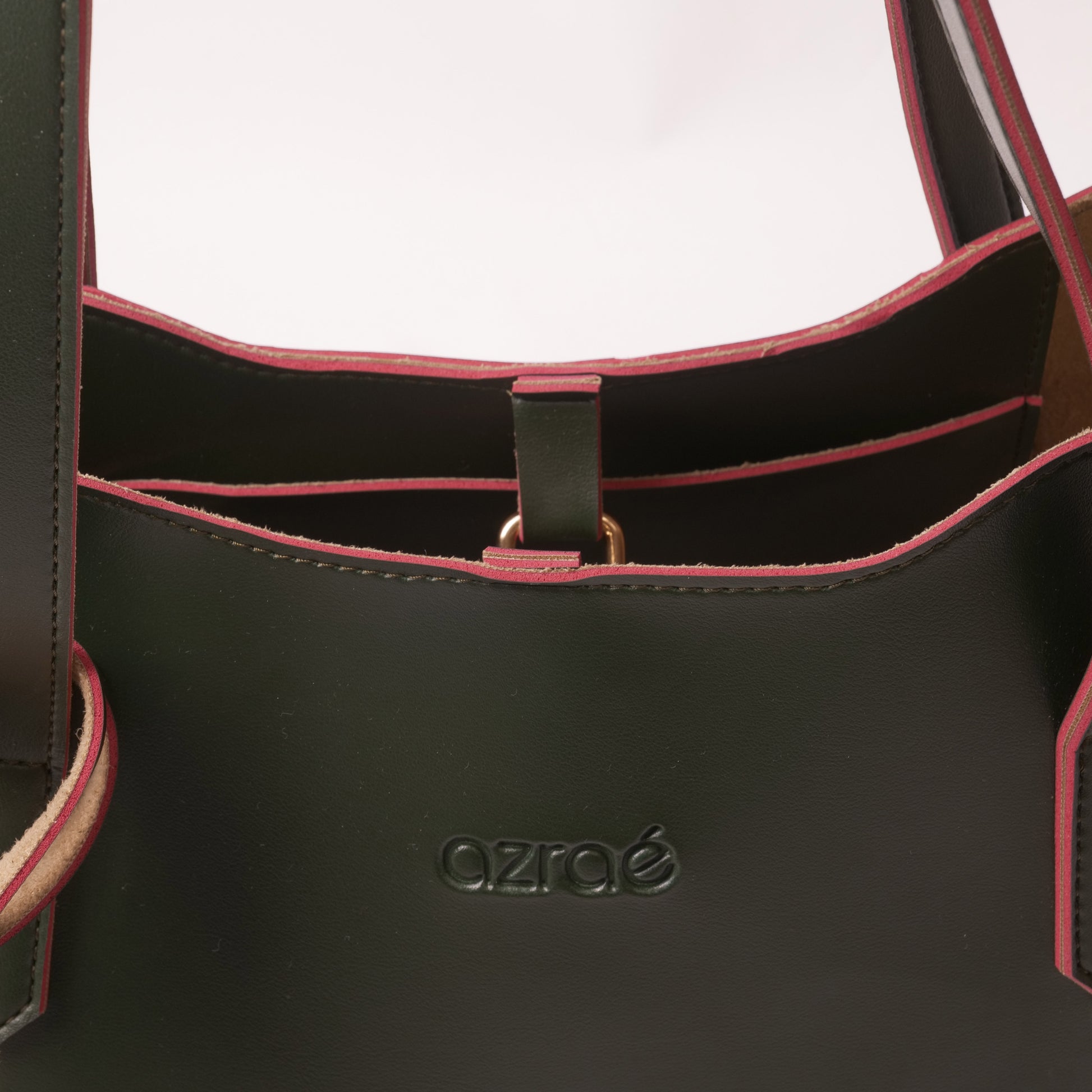 Elevate your style with this sophisticated Azraè Coach Green tote bag, featuring a striking red trim that adds a pop of color to its sleek design. Crafted from high-quality Micro Rexine, this spacious tote is perfect for daily use, whether you're heading to work or running errands. The bag boasts a structured shape with a flat bottom, ensuring it stands upright and maintains its form even when empty. The long, thin straps are adjustable, allowing for comfortable shoulder or hand carrying.