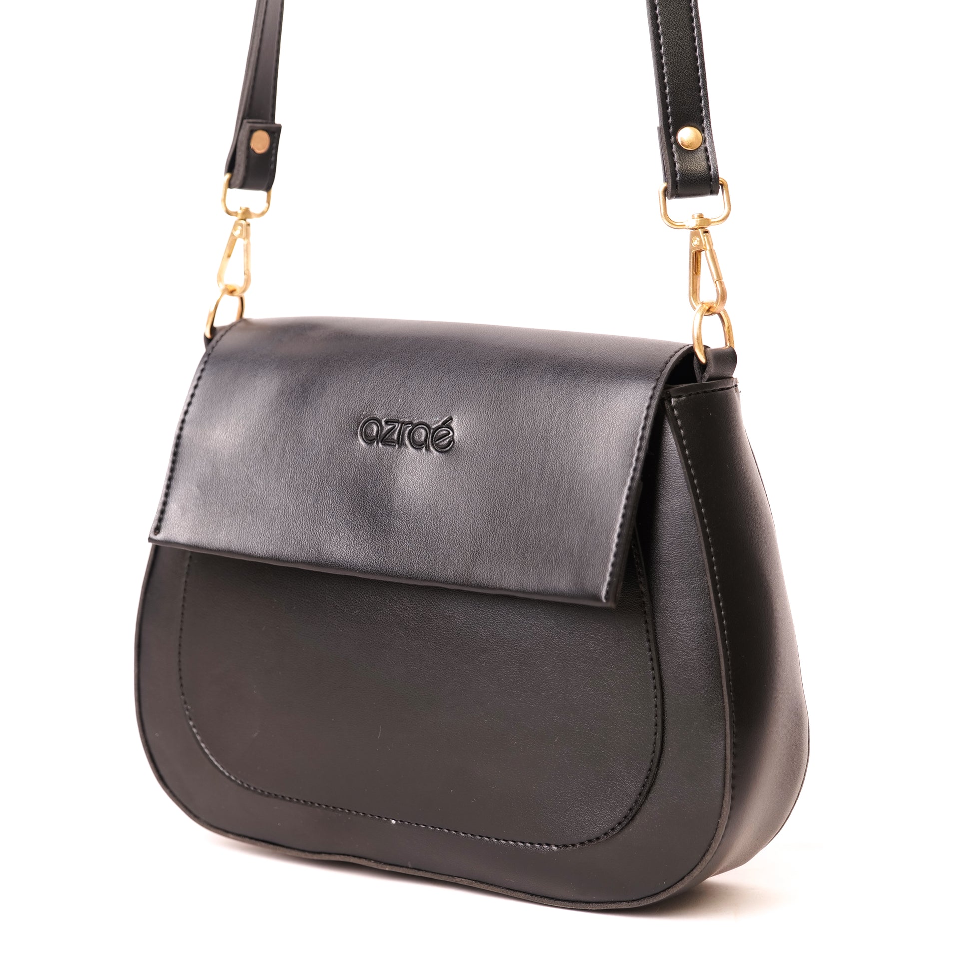 Elevate your style with the Azraè Black Micro Rexine Saddle Bag, a perfect blend of elegance and functionality. Crafted from high-quality Micro Rexine, this bag exudes sophistication and durability. The sleek black design, complemented by gold accents, makes it an ideal accessory for any occasion. The saddle bag features a flap closure and a long strap for versatile wear, whether over the shoulder or as a crossbody. Its compact size is perfect for carrying essentials while maintaining a chic look. Add a touch of luxury to your wardrobe with this timeless piece from Azraè.